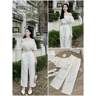 Set đũi nữ đi biển trắng quần dài áo sơ mi cao cấp
