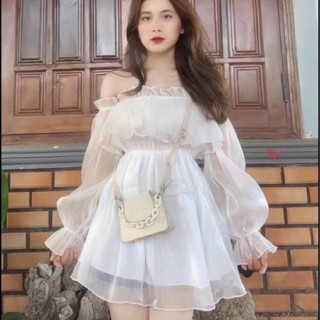 Áo Trễ Vai Dài Tay Voan Tơ Chun Eo Dáng Váy Tiểu Thư Màu Trắng