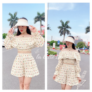 Set Áo Trễ Vai Hoa Nhí Tay Bồng Chun Eo Mix Quần Đùi Xoè Bồng