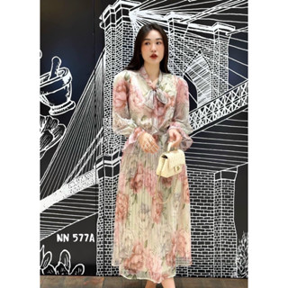 Váy tơ hoa chân xếp ly đều tay bồng cổ buộc nơ 2 lớp siêu xinh