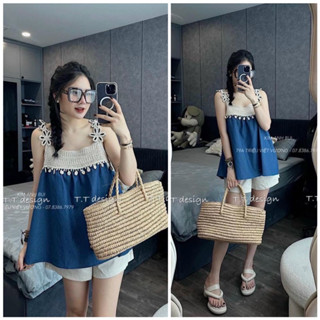 Set áo 2 dây jean nữ ren hoa thổ cẩm kèm quần sooc bánh bèo đi biển
