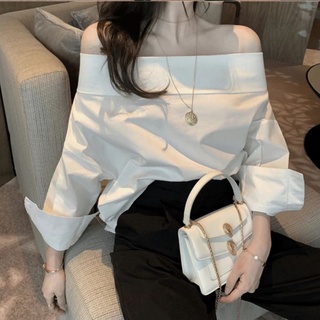 (SẴN) Lala.Clothing Áo sơ mi trắng trễ vai không co giãn M666