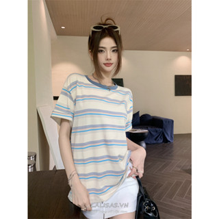 Áo Thun cotton Tay Ngắn Cổ Tròn Họa Tiết Kẻ Sọc Thời Trang Hàn Quốc Cho Nữ