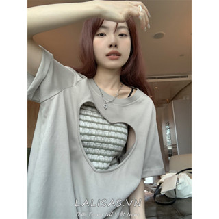Lalisas set Áo Thun Ngắn Tay Khoét Lỗ Hình Trái Tim Kẻ Sọc Phối Áo Sát Nách Dáng Rộng Thời Trang Cho Bạn Gái