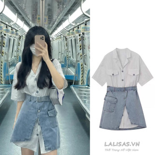 Lalisas Set Áo Sơ Mi polo Tay Ngắn Kẻ Sọc + Chân váy jean Xẻ Tà Phong Cách Hàn Quốc Cho Nữ
