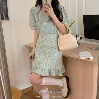 Lalisas Đầm chiffon Ngắn Dáng Chữ A Viền Bèo Tay Phồng In Hoa Màu Xanh Lá Kiểu Pháp Ngọt Ngào