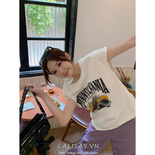 Áo Thun Tay Ngắn Cổ Tròn Màu Trắng In Họa Tiết LALISAS Niche Thời Trang Cho Nữ