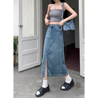 Lalisas Chân váy jean Chữ A Lưng Cao Xẻ Tà Phong Cách retro Hàn Quốc Cho Nữ