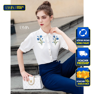 Áo sơ mi nữ hè Lamia Design LA286 lụa Hàn màu trắng họa tiết thêu hoa hồng xanh vạt đối xứng
