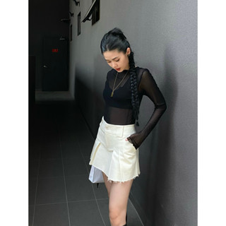 Chân váy xếp ly khaki form eo cạp thấp dưới rốn màu kem, là min - RAW CUT PLEATED MINI SKIRT - CREAM
