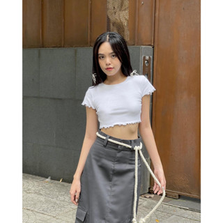 Áo croptop màu trắng, viền xoắn tay, là min - RUFFLE HEM RIBBED CROPTOP