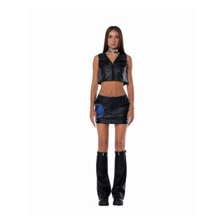 Váy da màu đen dáng ngắn form eo cạp thấp dưới rốn có túi phía trước, là min - LEATHER ASYMMETRIC WAIST MINI SKIRT