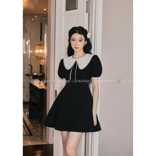 Váy đen cộc tay dáng xoè, Váy tay phồng cổ sen trắng xinh xắn kèm ảnh thật LanuShop