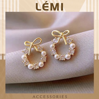 Bông tai nữ bạc 925 hình tròn đính đá mix nơ nhỏ xinh dễ thương thời trang Hàn Quốc Lemi accessories