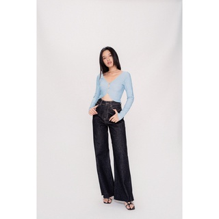 LIBÉ - Áo thun cổ chữ U ngắn ngang eo màu đen