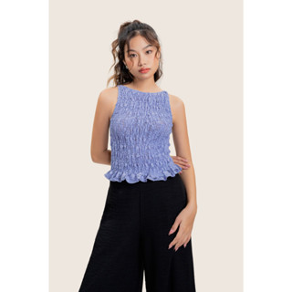 LIBÉ - Áo kiểu cổ yếm nhún thun trước ngực họa tiết sọc trắng nâu