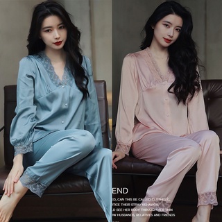 Bộ đồ mặc nhà pijama lụa phối ren cao cấp dài tay nữ tính mềm mịn, mát khi mặc