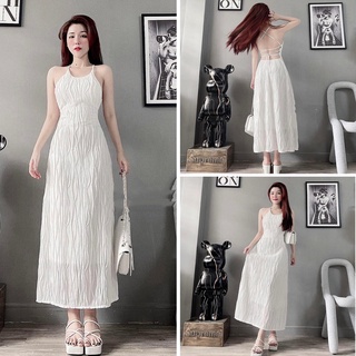 Đầm maxi tơ be cổ yếm dáng dài váy thiết kế nữ DN146