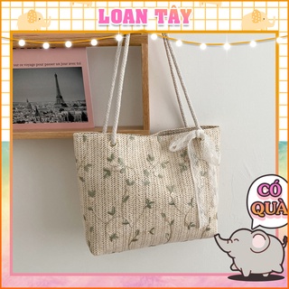 Túi Cói Vuông Lớn Đi Du Lịch Thêu Hoa Quai Thừng Thắt Nơ Ren L2154
