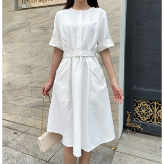 Đầm trắng cổ tròn phối dây eo màu trắng - Lovadova 22D09C003