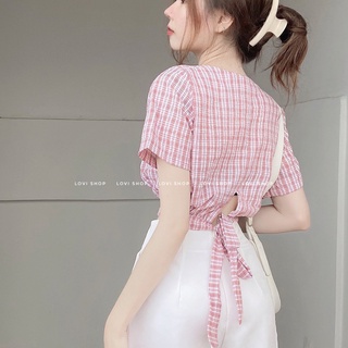 LOVI SHOP- Áo croptop caro nơ lưng cổ vuông tay ngắn 4 màu vintage