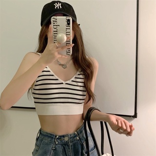 Áo Bra Sọc Ngang Trắng Đen Cổ V 4 Dây LSEOUL A2520 Chất Len Gân Dày Dặn