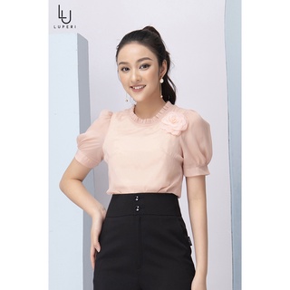 Áo Sơ Mi Tay Phồng Nữ LIPERI Thiết kế cổ tròn đính hoa ngực chất lụa tơ cao cấp mềm mịn nhẹ mát không nhăn LFSM1198