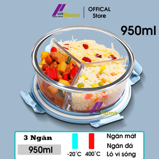 Hộp cơm thủy tinh 3 ngăn tròn 950ml, dùng được trong lò vi sóng, chống tràn Luxhome