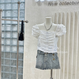 Sét áo sơ mi trễ vai trắng + quần sooc