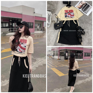 Sét áo phông the who màu be + chân váy bút chì đen viền be