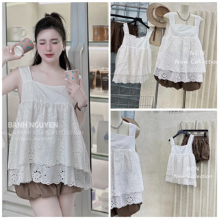 Sét áo dây bản to màu trắng + quần boom nâu