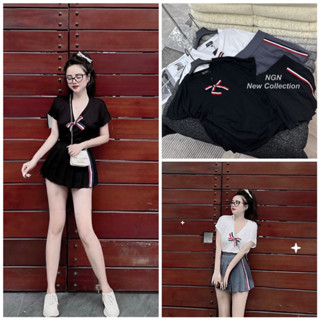 Sét áo phông cổ tim đính nơ+ chân váy Thome xếp li