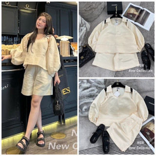 Sét áo sơ mi 4 cúc tay bồng + quần sooc hoạ tiết kẻ chìm