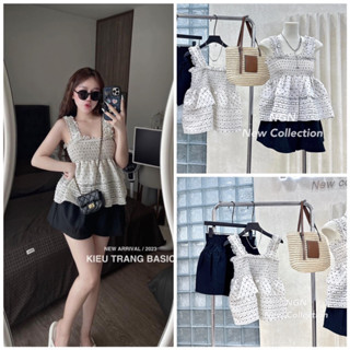 Sét áo sơ mi trễ vai chấm bi + quần sooc đen