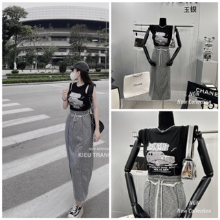 Sét áo ba lỗ cut out màu đen + chân váy bút chì màu ghi