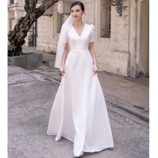 Váy cưới cô dâu đi bàn dự tiệc tiểu thư tay phồng cổ chéo đính ngọc