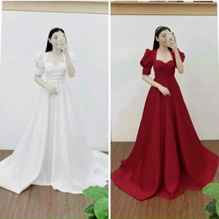 váy cưới dự tiệc cô dâu đi bàn tay phồng cổ vuông xẻ tiểu thư sang trọng
