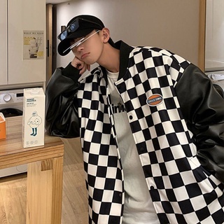 Áo khoác bomber làm từ da họa tiết ca rô thời trang cá tính trẻ trung cho nam và nữ