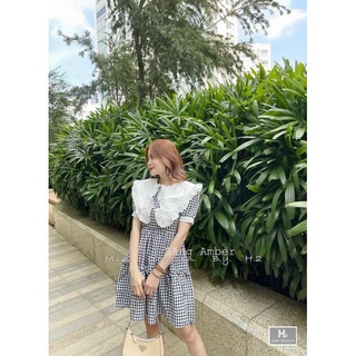 Đầm nữ tiểu thư caro đen tay búp dáng xòe, đầm caro cổ bèo trắng to, đầm cổ sen babydoll đi chơi dạo phố xinh xắn