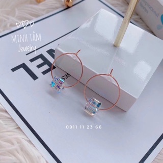 Bông tai hình khối pha lê lập phương bạc Ý xi kim