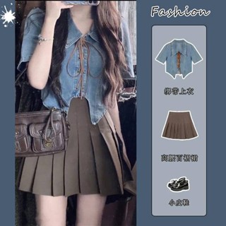 Bộ Áo Sơ Mi Denim Ngắn Tay Thắt Dây + Chân Váy Xếp Ly Lưng Cao Ôm Dáng Thời Trang Mùa Hè Cho Nữ