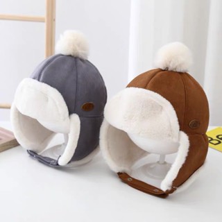 Mũ phi công quả bông che tai lót lông cừu siêu ấm cho bé