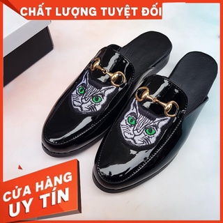 Giày sục da bóng THÊU HÌNH MÈO trang trí mác G.C kim loại.