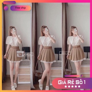 [Xả Kho] Set Áo Sơ mi Cổ Nhọn Mix Chân Váy Xếp Ly Nâu Kèm Đai ( Hàng Sẵn)