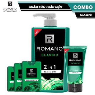 Combo Romano Vip gồm: 1 dầu gội 180g, 1 sữa tắm 180g, 1 xịt 150ml, 1 lăn Vip 50ml 1 wax Romano