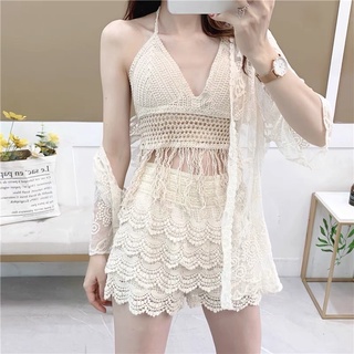 set biển - set 3 món - bra cổ yếm + quần ren hoa đều + choàng ren hoa nhỏ (có tách rời)
