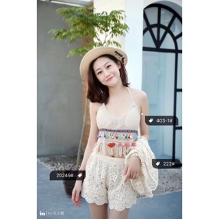set biển - bra yếm mix hạt + quần xẻ vạt + choàng ren hoa to (có tách rời)