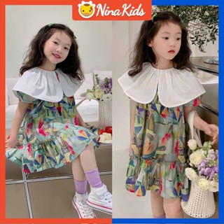 Đầm Tay Phồng Cổ Lá Sen In Họa Tiết Mực In Thời Trang Mùa Hè Cho Bé Gái 2-7 Tuổi