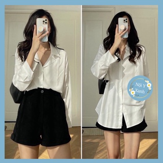 Áo sơ mi nữ dài tay form rộng thêu trái tim vải đũi 2 màu basic nội y xanh chất đẹp mầu trắng đen