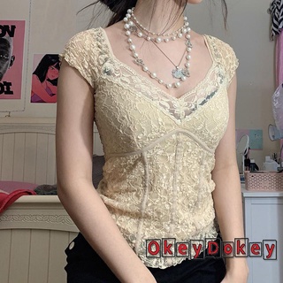 (Hàng Có Sẵn Sau Tết Trung Quốc) Áo Crop Top Không Tay Cổ Chữ V Phối Ren OKDK-y2k Fairycore